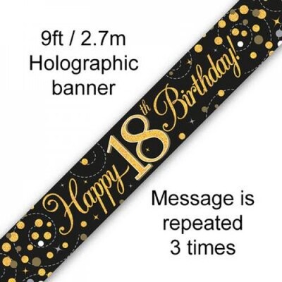 This Black & Gold 18th Birthday Foil Banner is the perfect addition for your 18th birthday party. Measuring approx 13cm in width and 2.7m in length the message is repeated 3 times. This banner can be left as one long banner or cut into 3 smaller banners. Matching perfectly with the rest of the Sparkling Fizz range or any of our Black and Gold items. It's sure to add some sparkly elegance to your party space!