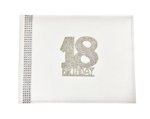 The book is covered in white faux leather and features a vertical row of diamantes on the left and a central 18th Birthday diamante plaque.