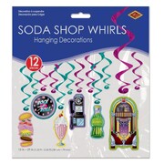 The pack contains 12 foil swirl decorations, 6 of which have an attached double-sided 1950's themed cardboard cutouts.