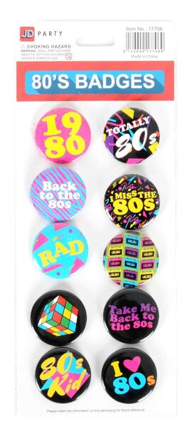 These metal badges measure approx. 3cm diameter and feature various colourful Eighties-style paterns and slogans - perfect for a quick and easy costume accessory.