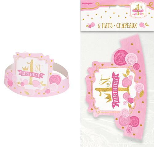 1st birthday pink & gold themed cardboard party hats, perfect for any 1st birthday party! Designed to fit children. Front of hat measures approx. 17cm x 11cm. 6 in a pack.