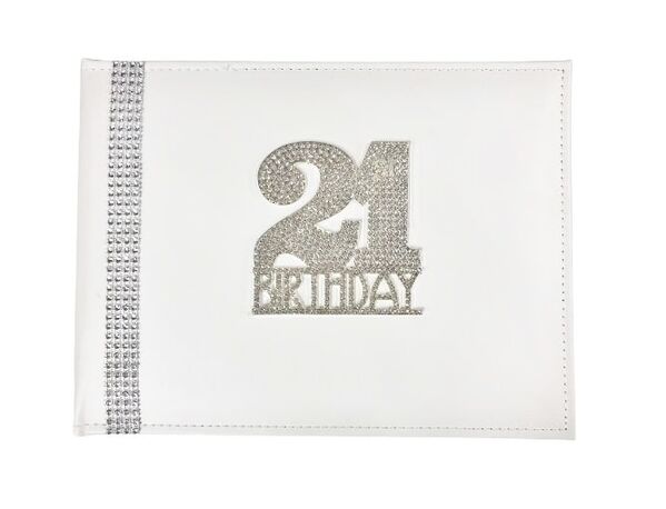 The book is covered in white faux leather and features a vertical row of diamantes on the left and a central 21st Birthday diamante plaque.