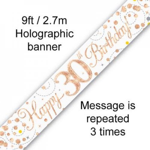 This Rose Gold and White Happy 30th Birthday Foil Banner is the perfect addition to your 30th birthday party. Measuring approx 13cm in width and 2.7m in length the message is repeated 3 times. This banner can be left as one long banner or cut into 3 smaller banners.