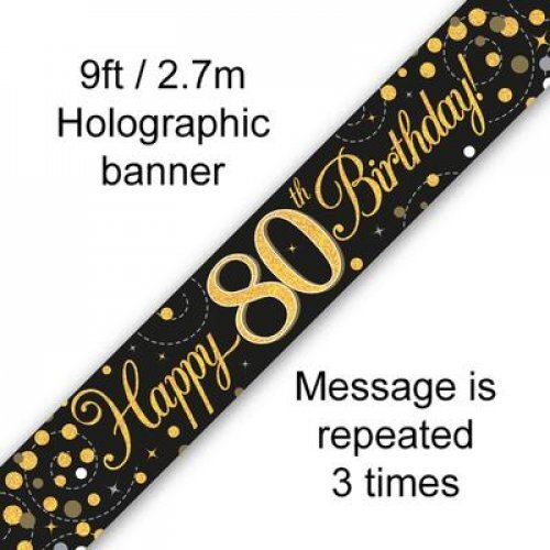 This 80th Black & Gold Happy Birthday Foil Banner is the perfect addition for your 80th birthday party. Measuring approx 13cm in width and 2.7m in length the message is repeated 3 times. This banner can be left as one long banner or cut into 3 smaller banners. Matching perfectly with the rest of the Sparkling Fizz range or any of our Black and Gold items. It's sure to add some sparkly elegance to your party space!