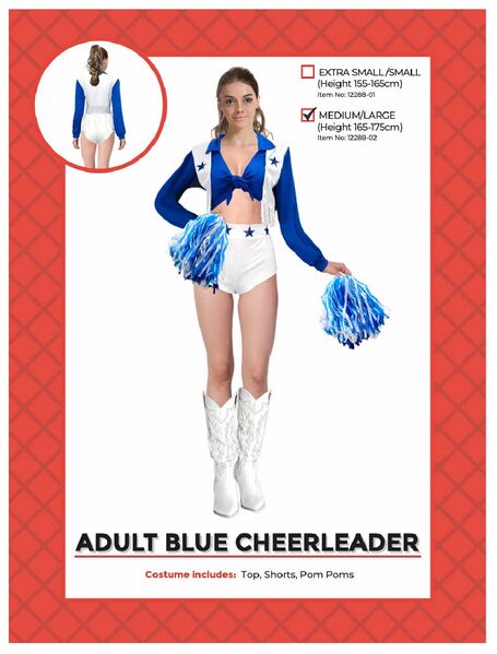 Bring the hype, the confidence and the sideline style with this bold American Football Inspired Cheerleader Costume. Designed with classic blue and white colours and standout star details, this outfit is made to turn heads from kickoff to afterparty.
