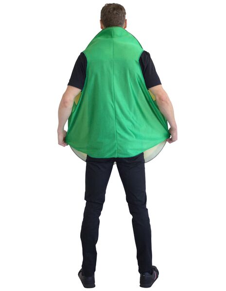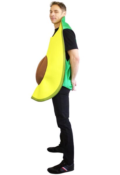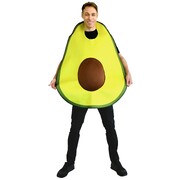 The tunic features a front foam avocado-shaped panel with brown seed & large face hole and a green stretch fabric back.