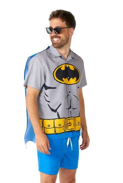 The button-up shirt is grey in colour with printed muscle detail, Batman logo and utility belt. It also has a removable blue cape with scalloped hem that attaches with hook & loop fasterner on the back of the shoulders.