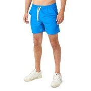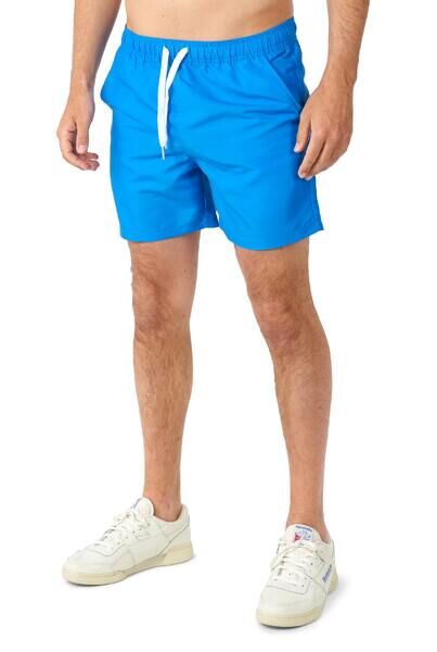 The shorts are made from blue fabric and designed in a boardshorts style with side pockets, elastic waist and drawstring ties for adjustable sizing.