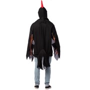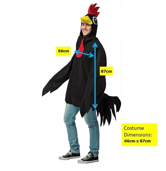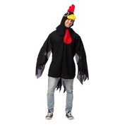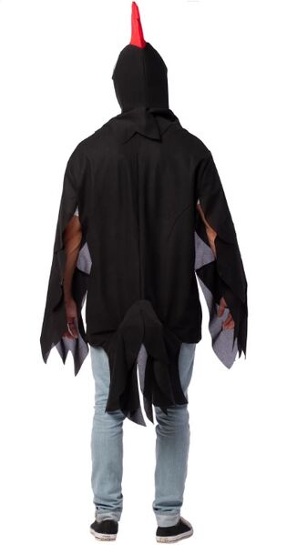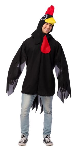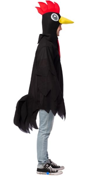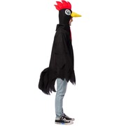 The pack contains includes a black tunic with attached wings & tail feathers and a rooster headpiece.