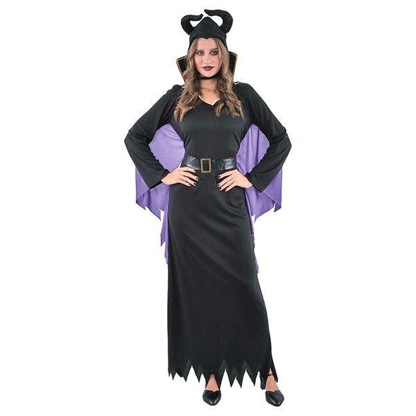 Perfect for Halloween, Maleficent and Disney Villains themes, this costume includes the dress with attached cape, belt & detachable collar and headpiece.