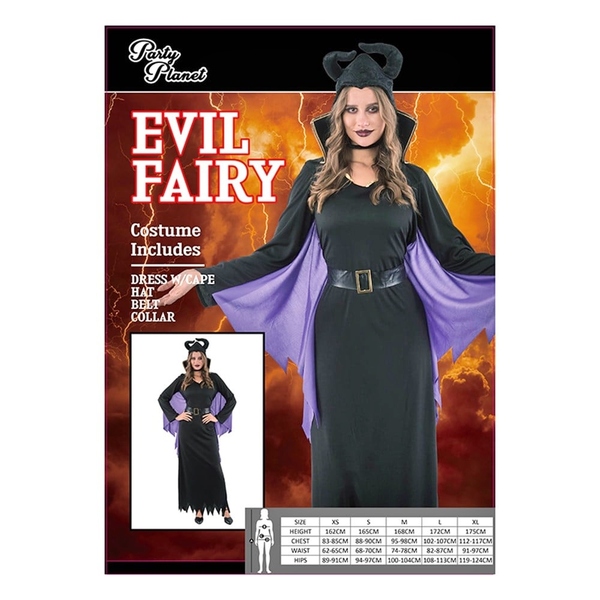 Perfect for Halloween, Maleficent and Disney Villains themes, this costume includes the dress with attached cape, belt & detachable collar and headpiece.