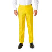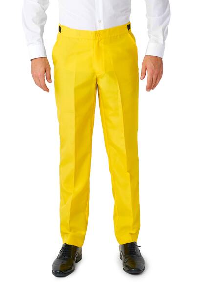 The yellow pants have a button and zip closure, belt loops, side pockets and elastic panels in the waistband for adjustable sizing.
