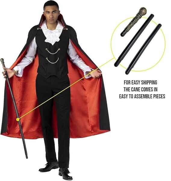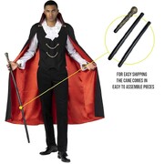 This costume provides a cool crisp silhouette while retaining the classic charms of ruffles, stand up collar, black & red colouring common to the traditional vampire costume.