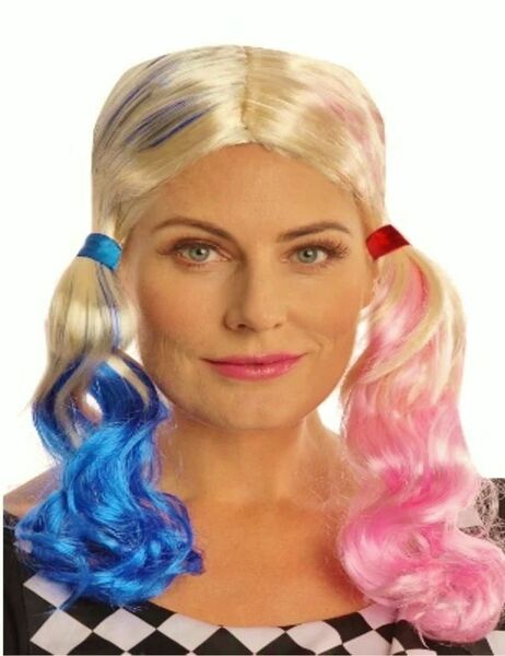 The wig is made from long synthetic yellow blonde & pink/blue hair styled into two side pigtails secured with coloured ribbons, attached to an elastic cap that will stretch to fit most adult heads.