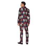 The jacket and pants are made from a dark blue polyester fabric printed with a contemporary sugar skull & red roses design.