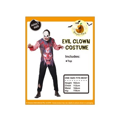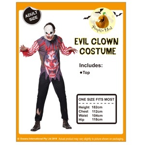 This adult size evil clown costume is perfect for any Halloween party! This costume includes the top ONLY. Costume is a one size fits most style. Easily coordinated with the rest of our costume supplies to ensure that your costume is one to remember!