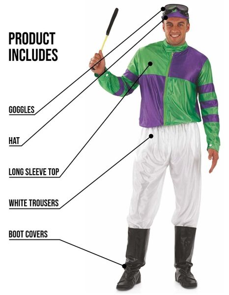 The bold green and purple colours capture the thrill and excitement of the racetrack while the costume pieces create a complete and authentic jockey look.