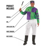 The bold green and purple colours capture the thrill and excitement of the racetrack while the costume pieces create a complete and authentic jockey look.