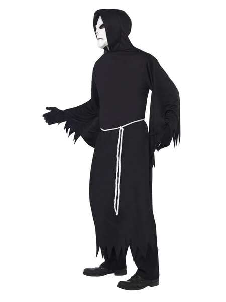 The long black hooded robe has tattered fringing on sleeves and hem and the costume includes a rope belt and creepy mask - perfect for giving everyone a good scare!