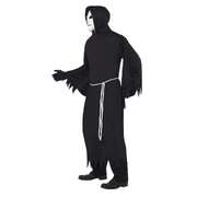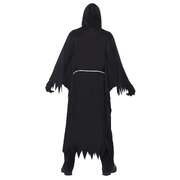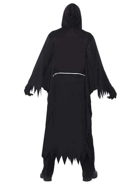 The long black hooded robe has tattered fringing on sleeves and hem and the costume includes a rope belt and creepy mask - perfect for giving everyone a good scare!