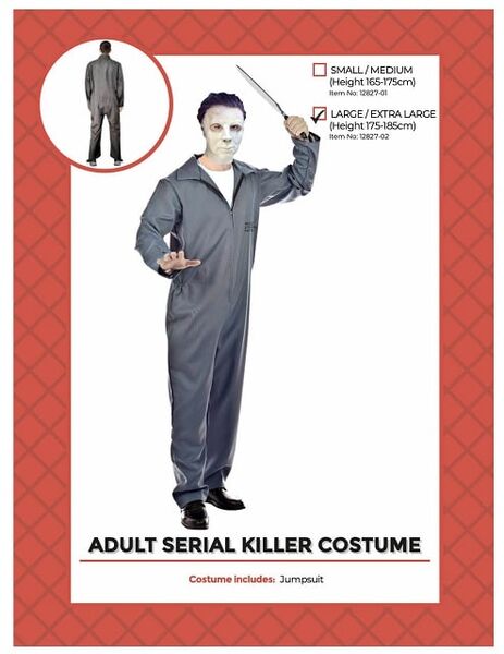 The pack contains a jumpsuit: grey polyester fabric, front zip closure, 'Hellevue State Mental Patient 999' logo on the front - just add your own knife and mask for a killer costume!