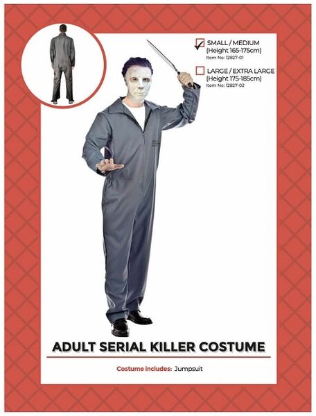 The pack contains a jumpsuit: grey polyester fabric, front zip closure, 'Hellevue State Mental Patient 999' logo on the front - just add your own knife and mask for a killer costume!