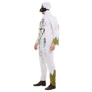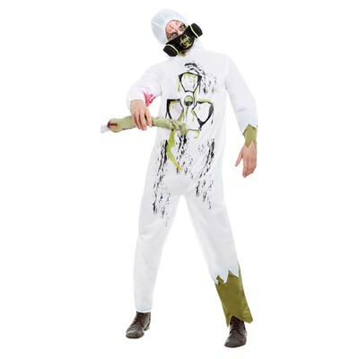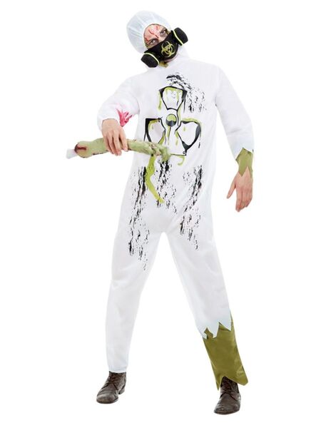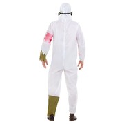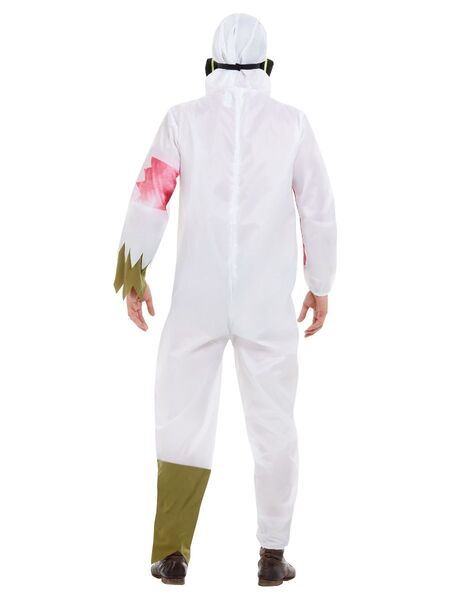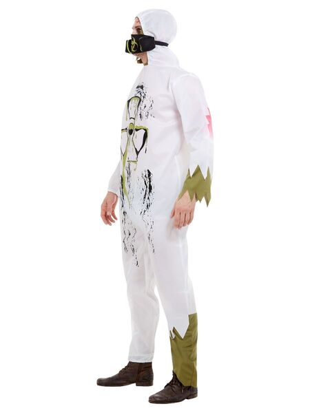 Adult male biohazard suit costume; includes all-in-one suit and mask. Costume is a size large (designed to fit a chest size of approx. 42-44 - see chart in images for approximate sizing.)