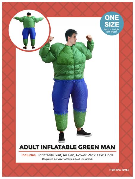 Fun and easy to use - simply step into the costume via the rear zipper opening - close the zip and make sure the neck, wrist and ankle fastenings are secure to stop the air escaping too quickly - turn on the battery pack and in a few seconds the costume will inflate and you'll be ready to smash!