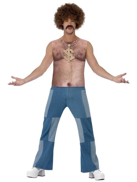 Print on vest includes: hairy chest and dollar sign necklace. Product does not include shoes, pants, fake moustache or wig. Vest does not have a print on the back.