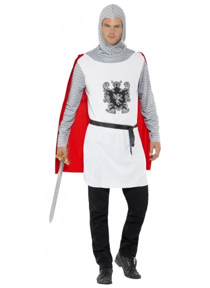 This adult knight costume is perfect for any costume party! This costume includes top with attached cape, belt and hood. Costume is a size medium (38-40" / 97-102cm.) Easily coordinated with the rest of our costume supplies!