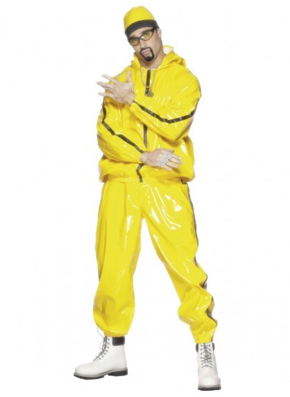 This adult male yellow rapper suit costume is perfect for heaps of different occasions! This costume includes yellow hooded jacket & trousers + hat. Costume is a size large (chest size 42-44.) Made from PVC (often called vinyl and has a surface of shiny plastic).