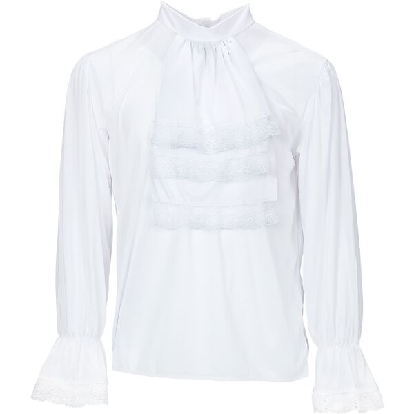 The shirt is made from white stretch synthetic fabric and features a high neckline, front ruffle/jabot, lace trim on ruffle and wrists and hook & loop closure tabs at the back of the neck.