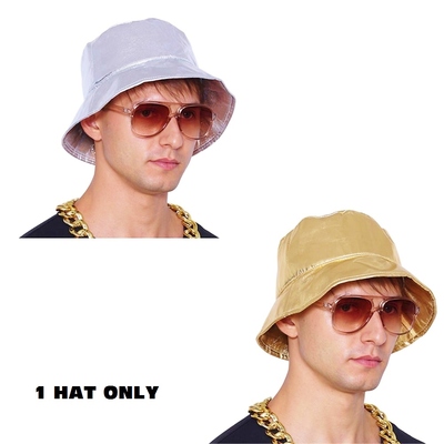 These hats are made from durable metallic polyester fabric and have a white lining.