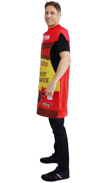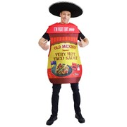 The tunic features a foam front printed with a classic taco sauce jar design, Old Mexico branding and a 'I'm very Hot' warning and a stretch fabric back.