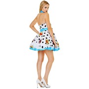 Adult costume including dress, scarf, belt and headband. Perfect for a 1950's or art themed party.