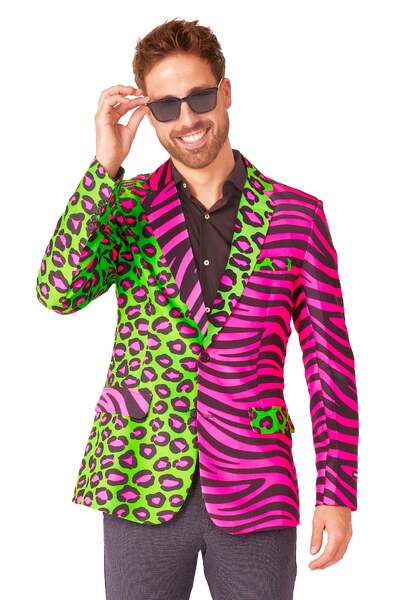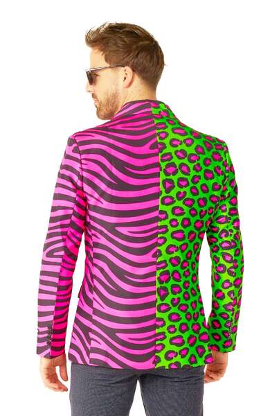 This premium quality tailored jacket is made from polyester fabric with pink & black zebra-print on one side and green & pink cheetah spots on the other side with contrasting lapels and faux pockets.