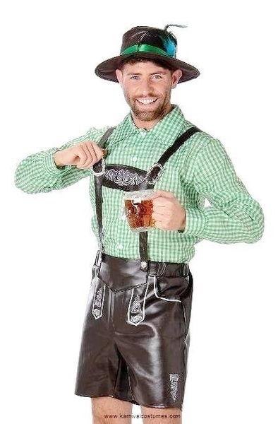 Get ready to celebrate in style with this three-piece set including lederhosen, shirt and hat.
