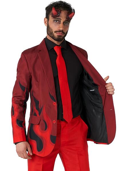 The tailored jacket is made from dark red polyester fabric printed with a black and red flames print on the bottom edge and sleeves.