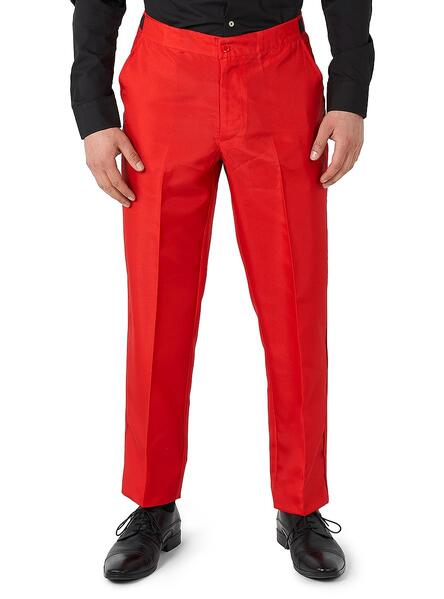 The coordinating tie is made from the same red fabric as the trousers.