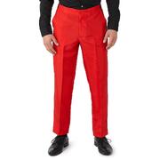 The pants are made from bright red polyester fabric and have a button and zip closure, side pockets and elastic panels in the waistband for adjustable sizing.