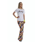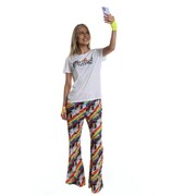 The trousers are made from stretch rainbow fabric, have an elastic waist and flare slightly from the knee.