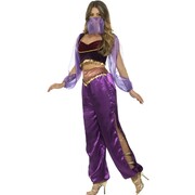 This adult purple Arabian princess costume is perfect for heaps of different occasions! This costume includes the trousers, top and face veil. Costume is a size small (designed to fit a women's UK size of approx. 8-10 - see chart for approximate sizing.)