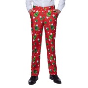 The matching jacket and pants are made from red 100% polyester fabric with a fun Christmas print featuring Christmas trees, stars and snow.