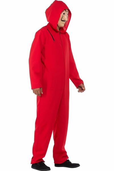 The pack contains a hooded red jumpsuit with front zip closure and elastic around the wrists & ankles and a plastic Salvador Dali mask.