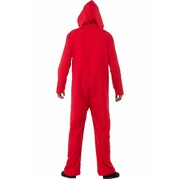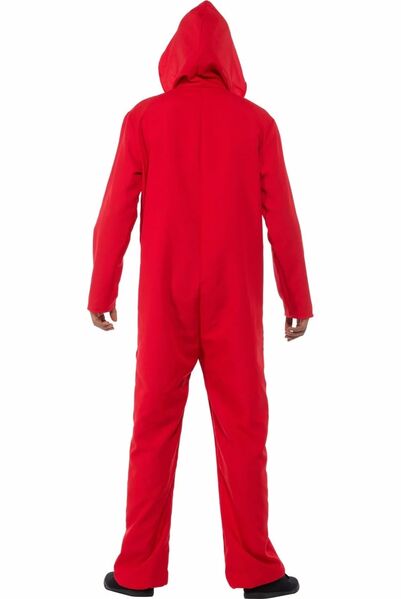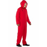 The pack contains a hooded red jumpsuit with front zip closure and elastic around the wrists & ankles and a plastic Salvador Dali mask.