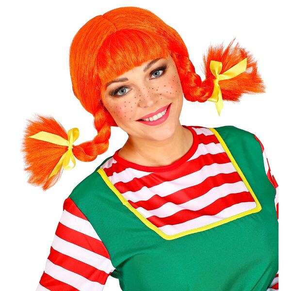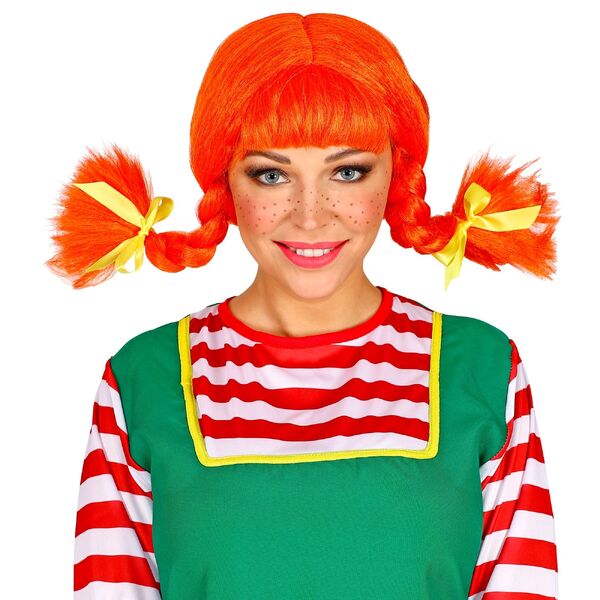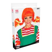 The wig is made from synthetic bright red hair styled into thick bendable plaits with blunt fringe, attached to an elastic cap that will stretch to fit most adult heads.