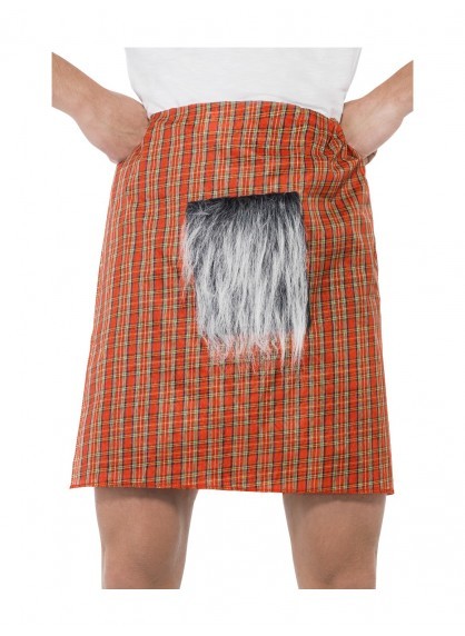 Red tartan kilt with sporran, perfect for any costume party! Designed in a one size fits most style. Kilt has velcro pieces attached to tie around waist. 100% polyester.