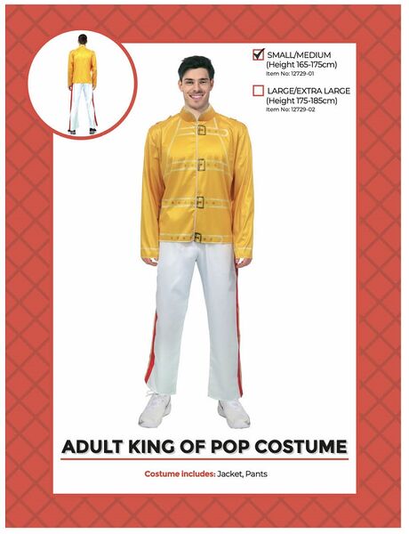 Featuring a bold yellow long sleeve zip-up jacket with printed buckle detailing and classic white pants with a red side stripe, this outfit captures the essence of a true music legend.