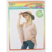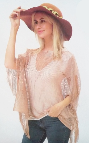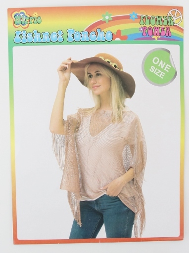 Rose gold fishnet poncho, perfect for a 60's hippie costume! Designed to fit most adults. 100% polyester.