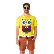 The button-up shirt is yellow in colour with printed SpongeBob face and neck tie details on the front.